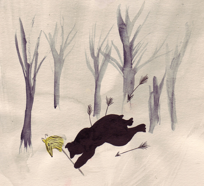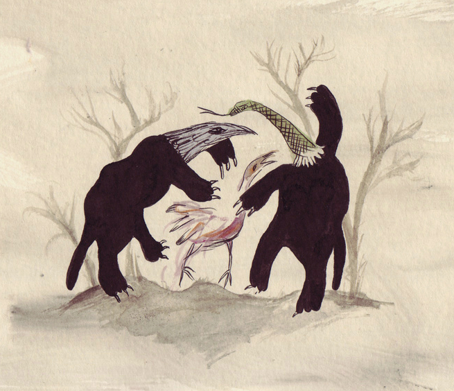 These watercolours are part of my Battle of Birlundula series. Birlundula is an imagined island where bears and birds battle with each other. They have lots of scraps and try and fool one another by masquerading as one another. I have more images from Birlundula in Screenprints.