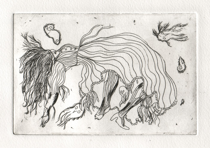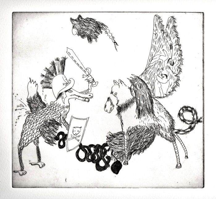 I made these etchings a few weeks ago with my friend Nick Morley (who is in my ‘Links’ section on this blog). We each drew part of a drawing onto the etching plates and passed them back to each other to continue the drawings, a bit like the game Consequences.