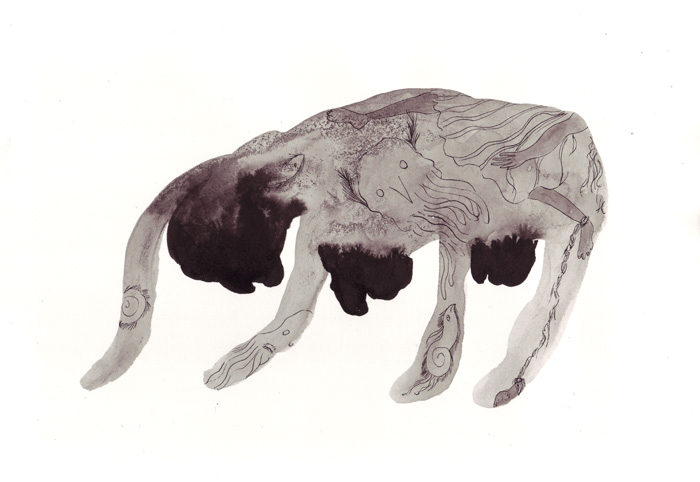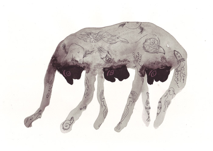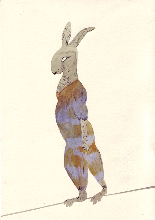 More on my Birlundula series..an island full of birds and big mammals, battling out their territory. They often masquerade as one another to trick one another, sometimes grusomely wearing the head’s they’ve won in battle. I got that idea from looking at the shrunken heads in the Pitt Rivers Museum, Oxford. These were used as trophies and worn around the necks of the victorious!